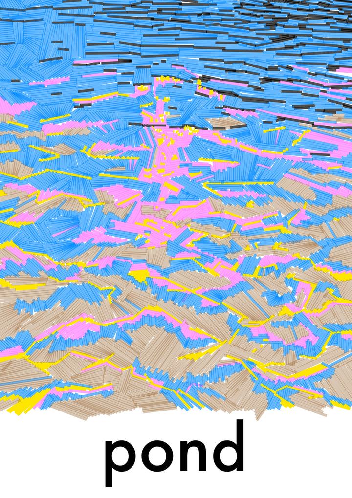 The “pond” series depicts a waterside scene with lines that look as if they were painted with color highlighter markers.